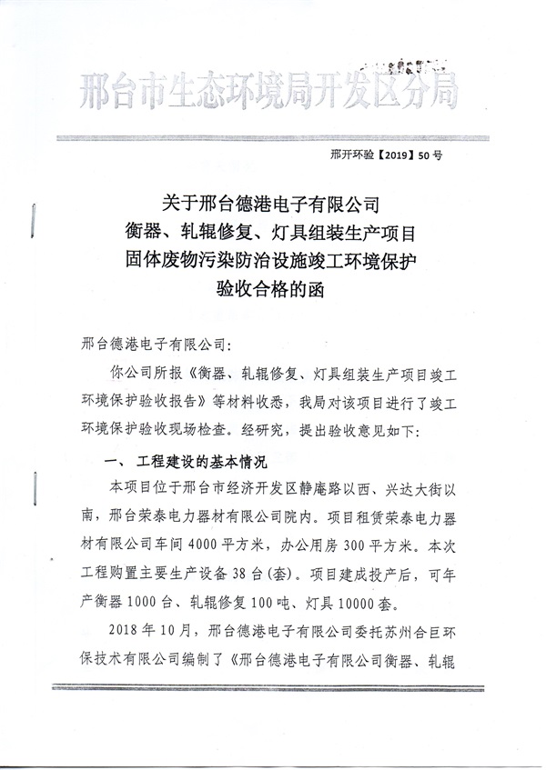 關(guān)于邢臺(tái)德港電子有限公司竣工環(huán)境保護(hù)驗(yàn)收合格的函